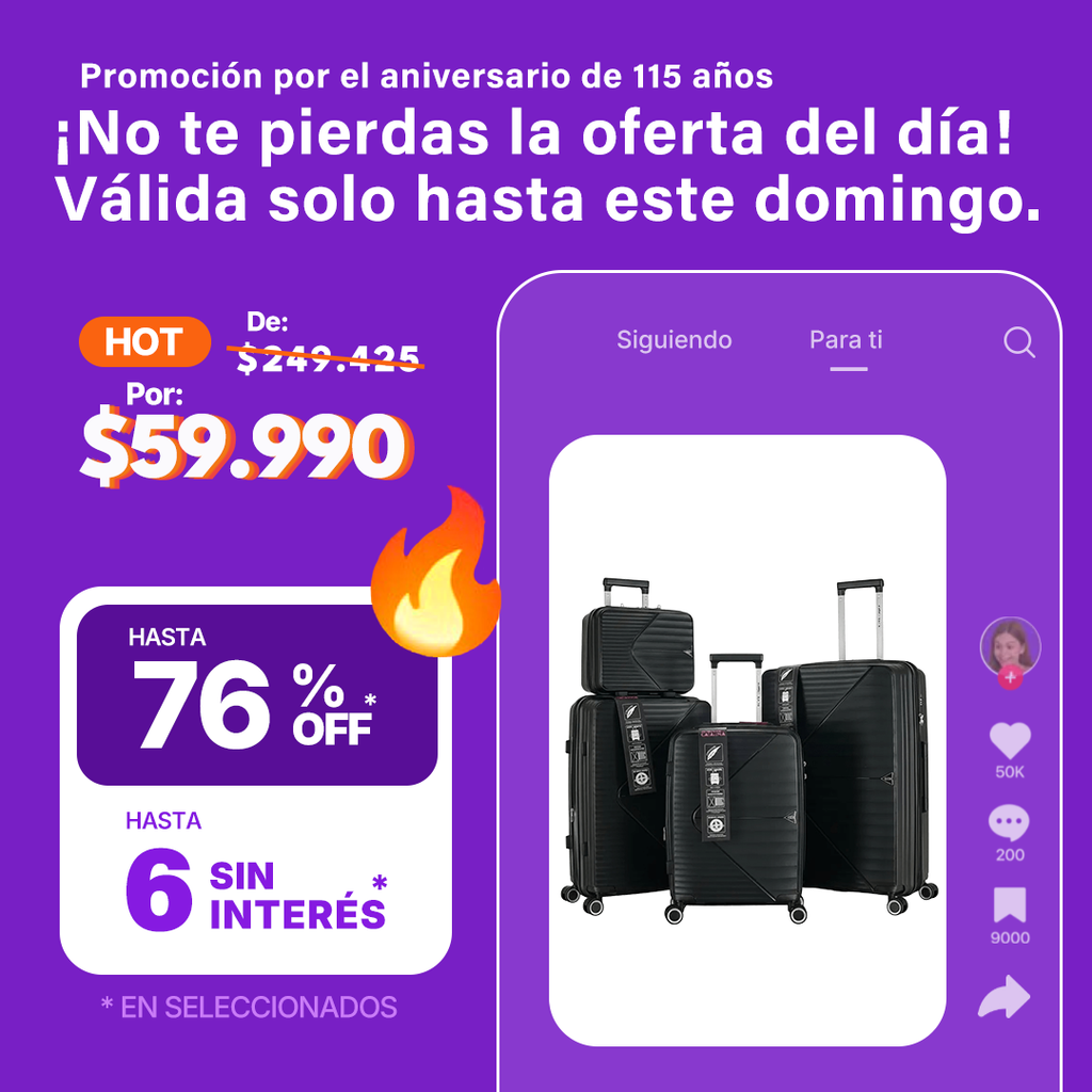 Cada valija incluye mango telescópico ajustable, manijas superiores y laterales reforzadas, y interior forrado con separadores y correas elásticas para mantener la ropa organizada. El set incluye tamaños S, M, L y XL, perfectos para diferentes duraciones de viaje.